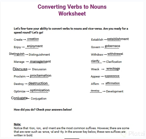 Para convertir un verbo en un sustantivo, basta con agregarles un determinado sufijo como: “-ion”, “-tion”, “-ness”, “-ment”, “-ity”, “-ry”, “-al”, “-ance”, entre otros. Con la experiencia en el idioma, sabrás qué terminación utilizar con cada verbo.