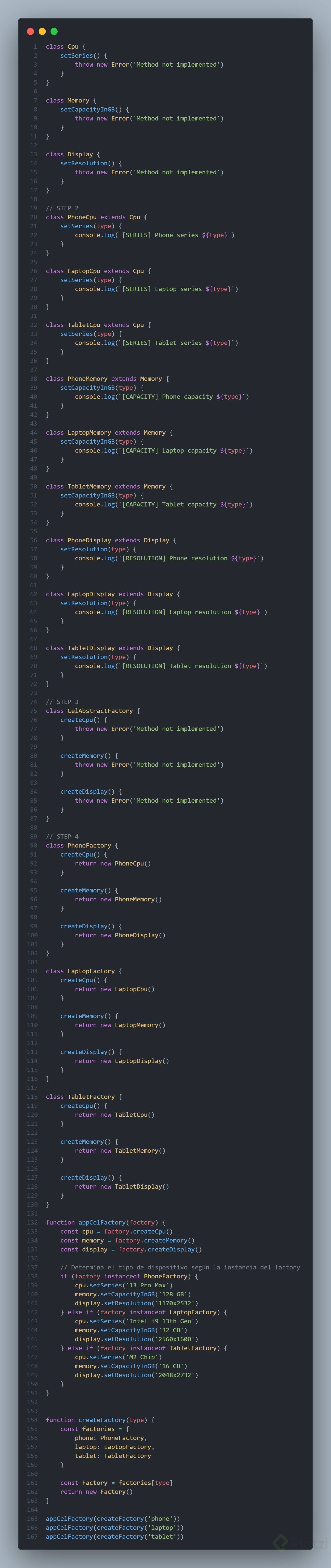 Implementa las fábricas específicas: Crea fábricas para cada tipo de dispositivo que ensamblen los productos específicos requeridos.