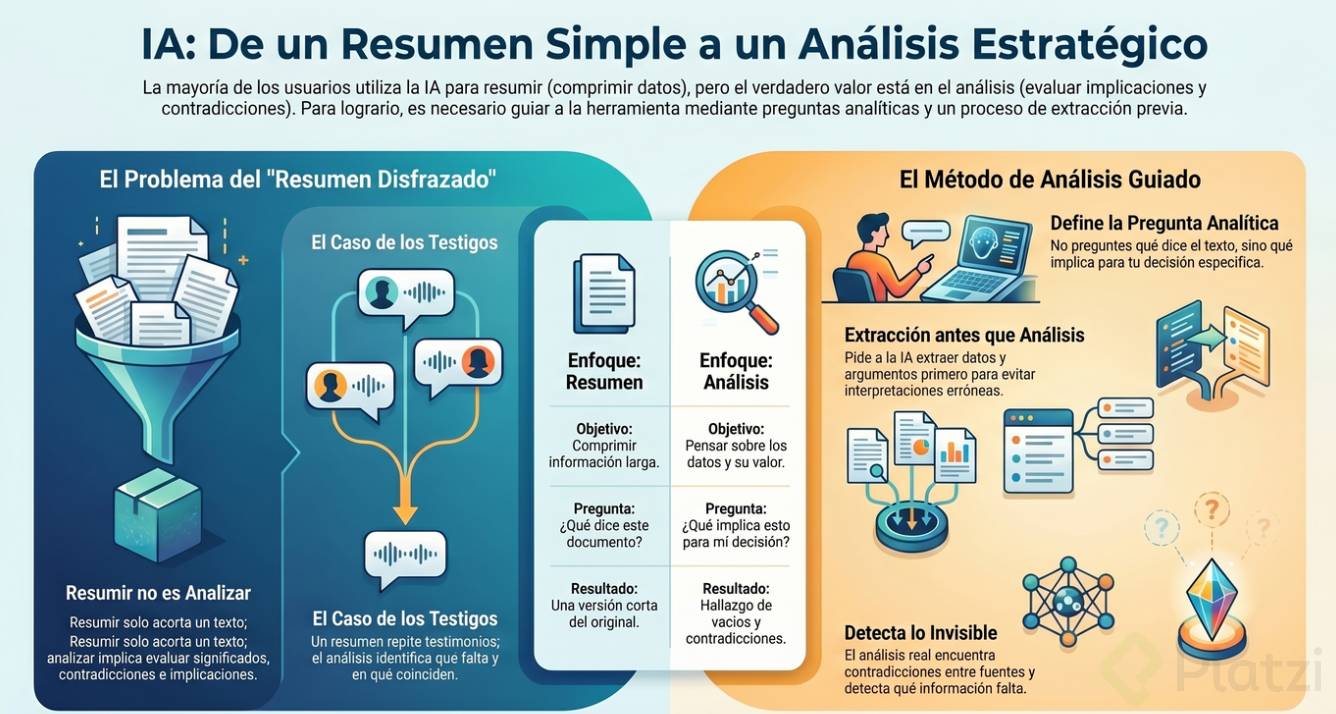 Esta distinción es fundamental y a menudo se pasa por alto. Resumir es comprimir: tomar algo largo y hacerlo corto [0:25]. La IA es muy buena en eso; se le entrega un documento de veinte páginas y devuelve media página. Pero eso no es un análisis.
