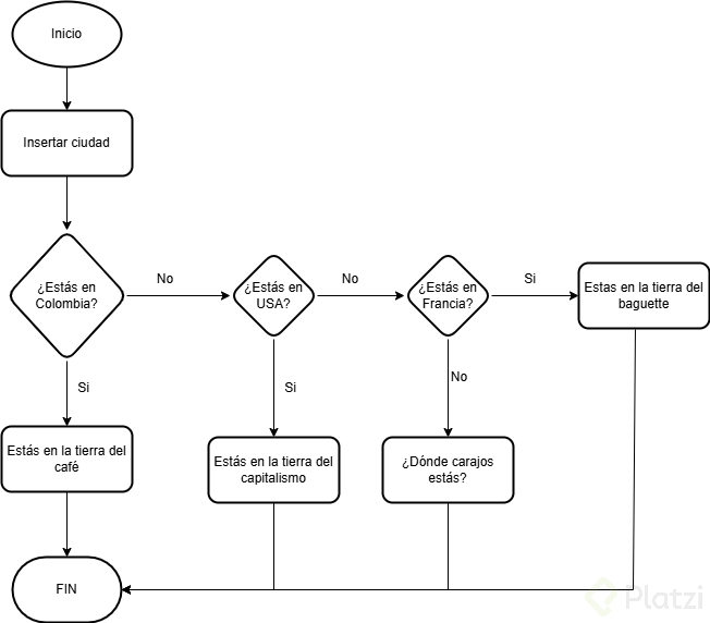 En este ejemplo, trabajaremos con 4 ciudades (Bogotá, New York, París y Medellín). Vamos a llevar este ejemplo a un diagrama de flujo que nos permita validar, si estas ciudades pertenecen o no pertenecen a nuestro país de ejemplo que será Colombia.