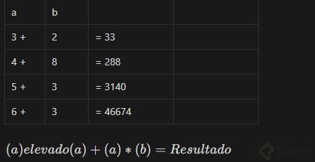 3 + 2 = 33 4 + 8 = 288 5 + 3 = 3,140 6 + 3 = 46,674