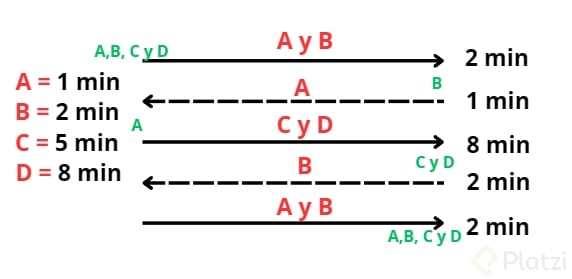Algo importante que debes saber es que nuestro ejemplo todavía carece de estrategia definida. Hemos establecido el orden de eventos pero no especificado la secuencia exacta: ¿Quién cruza primero? ¿Quién regresa a buscar a los demás? ¿Cuánto tarda en hacerlo?