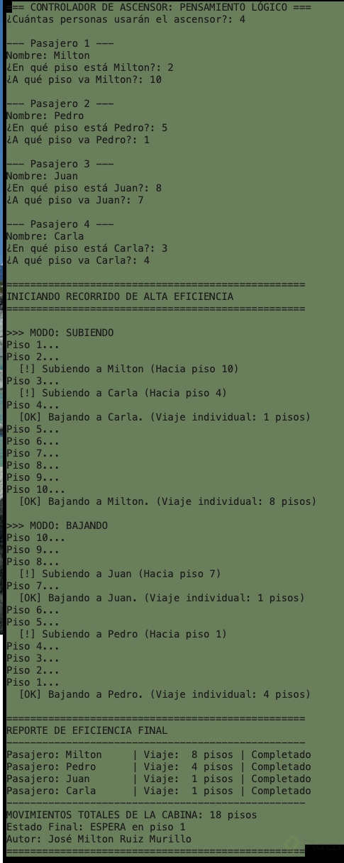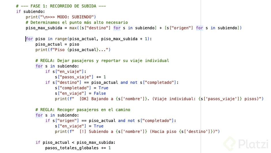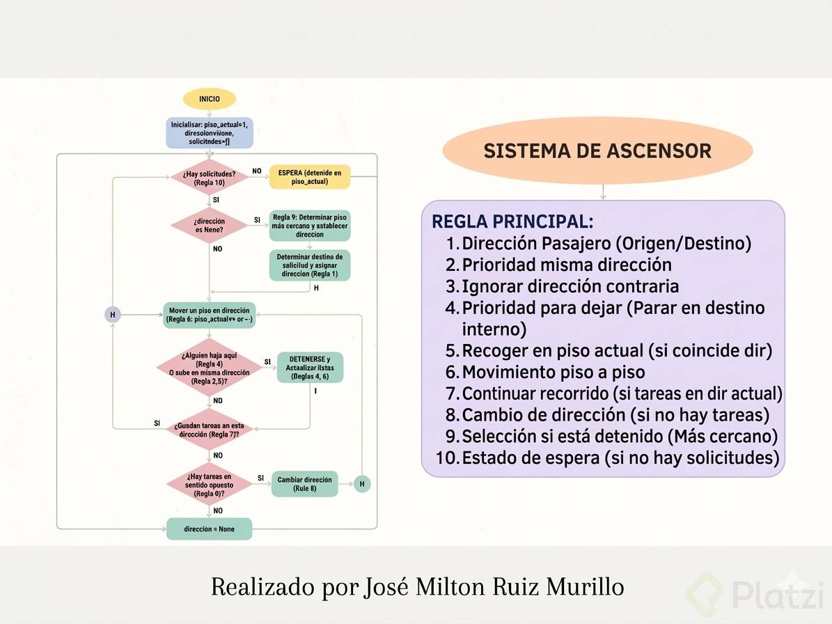 Optimizar el recorrido de un ascensor en un edificio de varios pisos requiere aplicar pensamiento lógico y estructurado. Vas a resolver un desafío práctico creando un diagrama de flujo y el código necesario, en cualquier lenguaje de programación, para lograr que un ascensor transporte eficientemente a varias personas desde diferentes pisos y hasta distintos destinos, reduciendo tanto el tiempo empleado como la cantidad total de paradas.