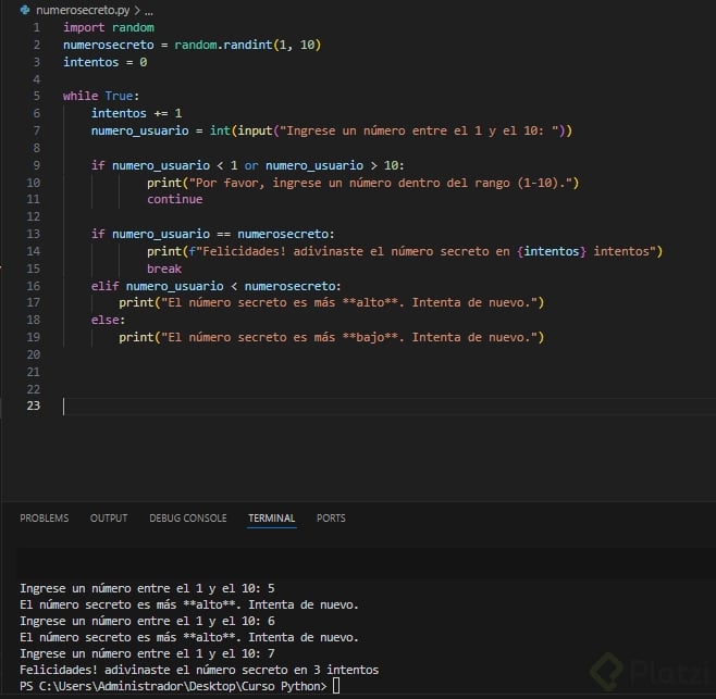 Este ejemplo sencillo nos ayuda a entender conceptos básicos como generación de números aleatorios, manejo de bucles y condiciones, y la interacción con usuarios mediante terminal.