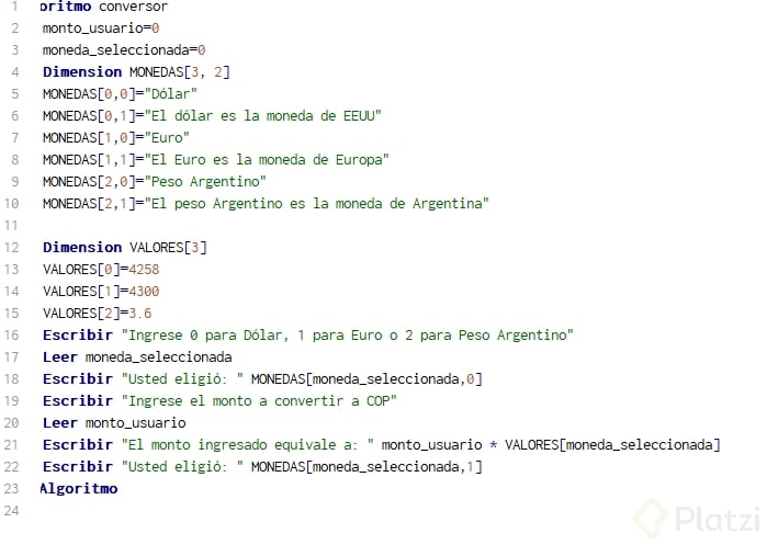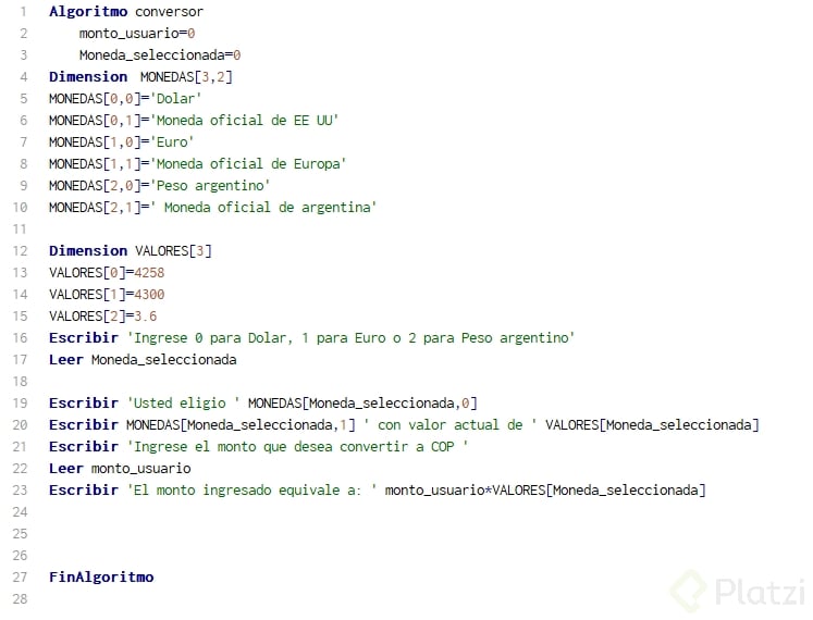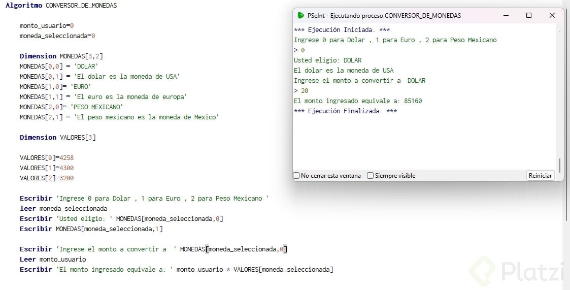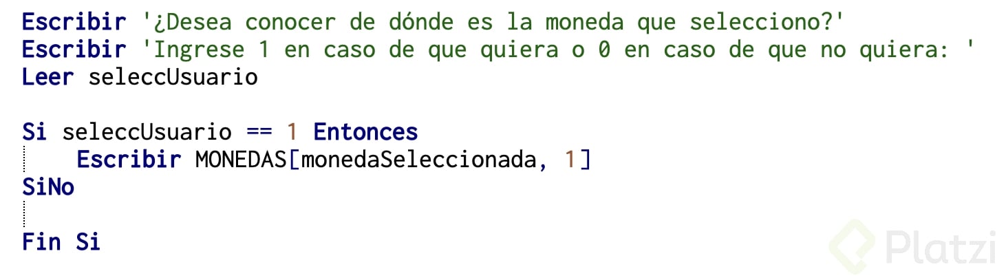 Ya que se maneja una matriz bidimensional (monedas), es clave acceder correctamente usando índices dobles: el primero indica la selección del usuario y el segundo selecciona la posición dentro de esa sublista (cero en el ejemplo que refiere al nombre de la moneda).