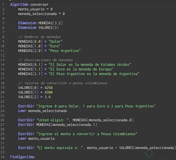 Para realizar posteriormente la conversión deseada, se multiplica el valor proporcionado por el usuario (monto usuario) por el valor almacenado en el array valores. El índice dentro de este array corresponde nuevamente al índice guardado anteriormente en moneda seleccionada.