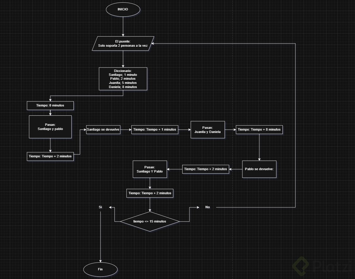 Una estructura condicional, visualmente representada por un rombo en los diagramas de flujo, nos permite evaluar si un resultado específico cumple con lo esperado. Por ejemplo, al finalizar el cruce del puente, se coloca una condición preguntando si el tiempo acumulado es menor o igual a quince minutos: