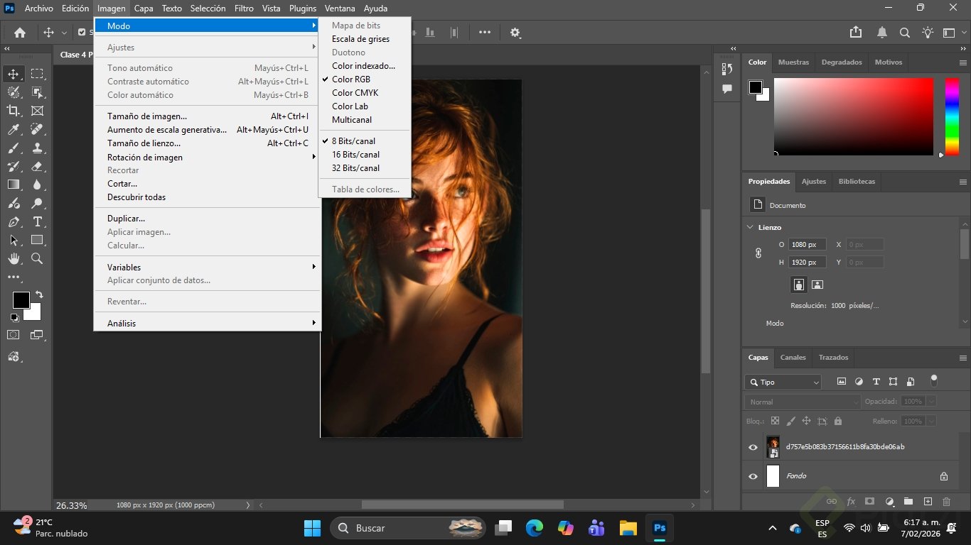 - Modos de color principales: 4 (RGB, CMYK, Escala de grises, LAB)