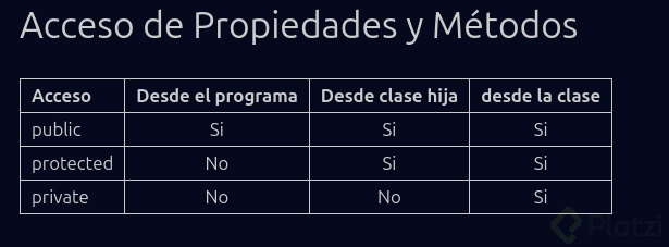 Público: Los elementos definidos como públicos son accesibles desde cualquier punto del código. Esto significa que tanto las clases como otros archivos pueden acceder a estos elementos.