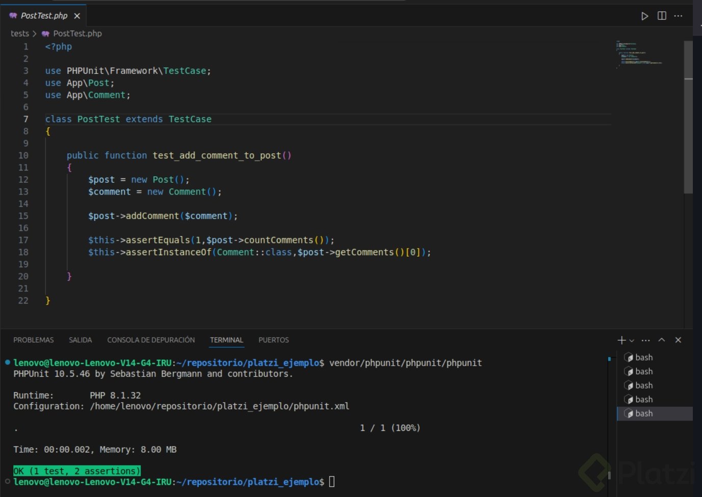 Post, implementamos el métodoaddComment. Este método se asegura de recibir un parámetro que es una instancia de la claseComment. Esto garantiza que los comentarios añadidos sean válidos y pertenezcan al mismo espacio de nombres.