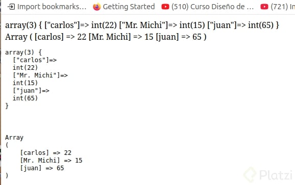 Se observa un arreglo o array con el cual podemos almacenar más de un dato. Si queremos observar en consola el contenido y detalles sobre esta variable, podemos usar var_dump():