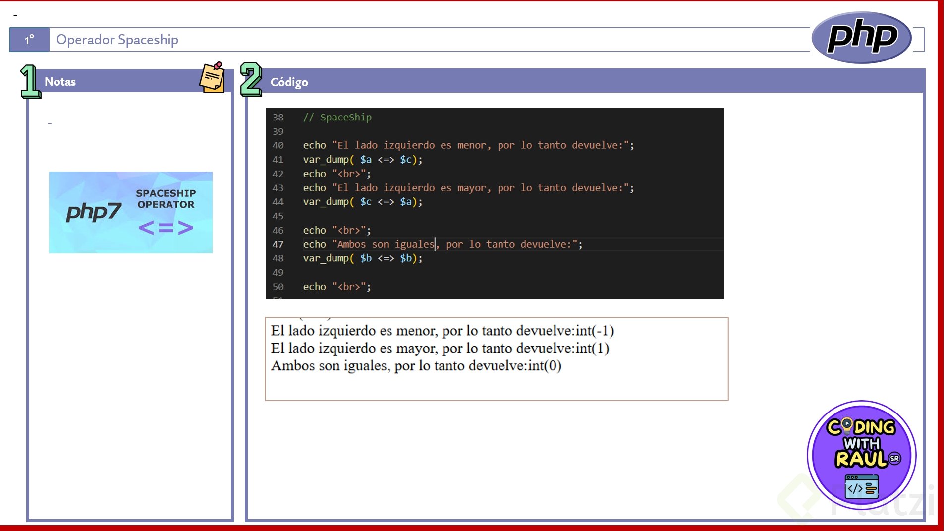 PHP posee un par de operadores que en la mayoría de lenguajes, si es que en ninguno, no los encuentras y están disponibles a partir de la versión 7. Estas tienen el nombre de Nave espacial y Fusión de null.