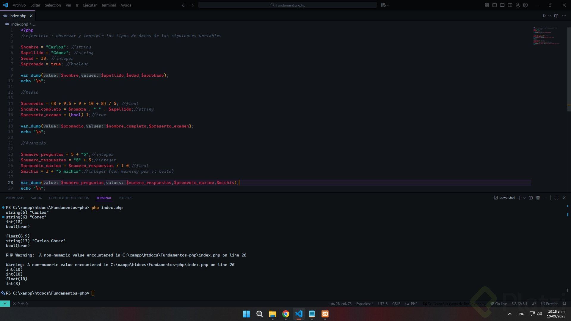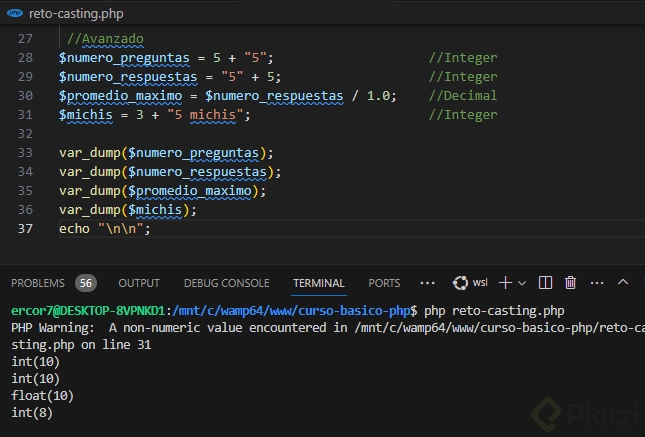 Stringse encuentre al principio. Finalmente, al ser los 2 números a sumar de tipo integer (3 + 5 = 8), el tipo de dato de$michisserá también integer. En este contexto siempre te mostrará un aviso (Warning).