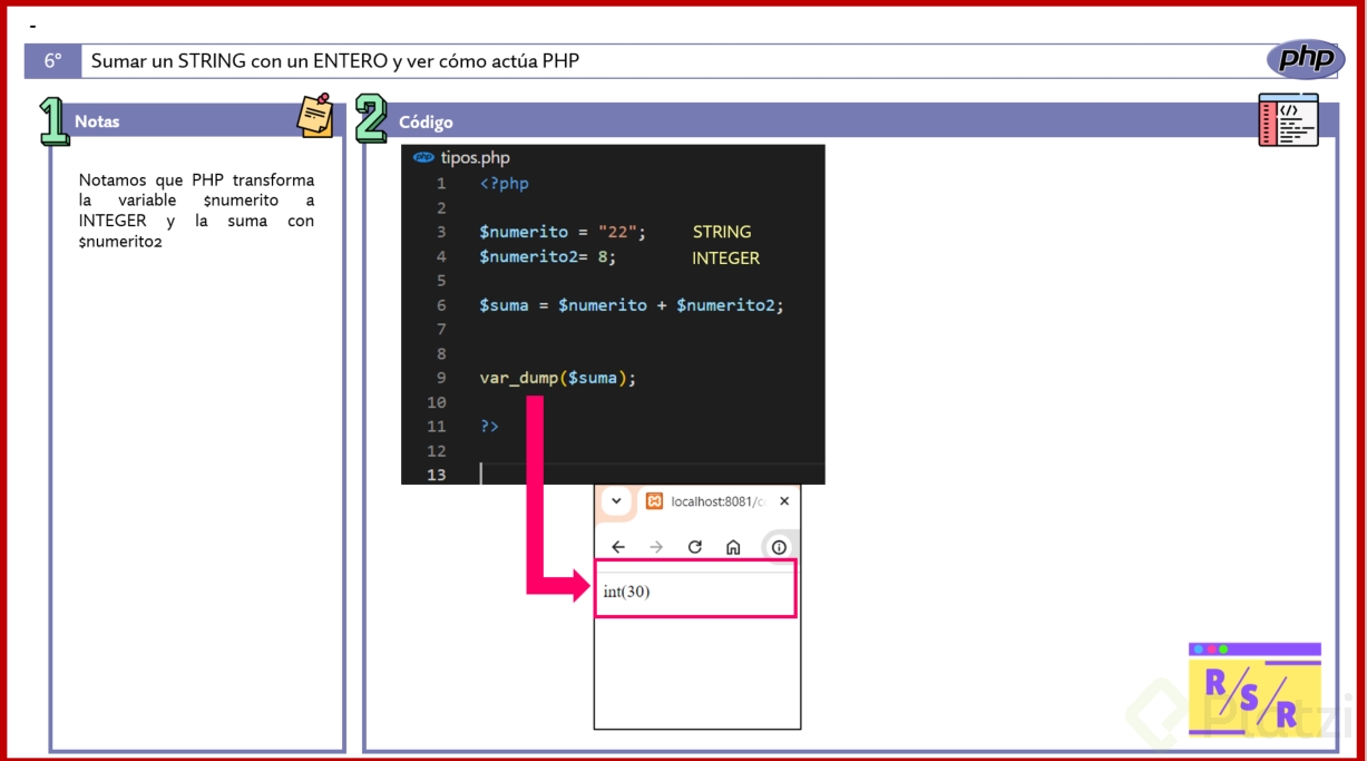 Si ejecutamos nuestro archivo PHP nos indica que $numerito es de tipo integer (int) con un valor de 25, es decir, realiza la conversión internamente de String a int de la cadena "23" y luego le suma el número 2: