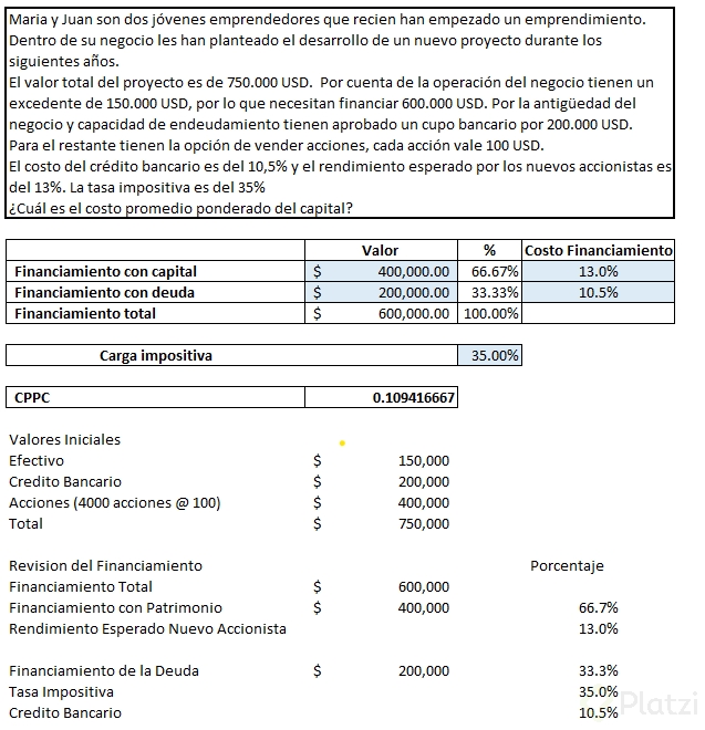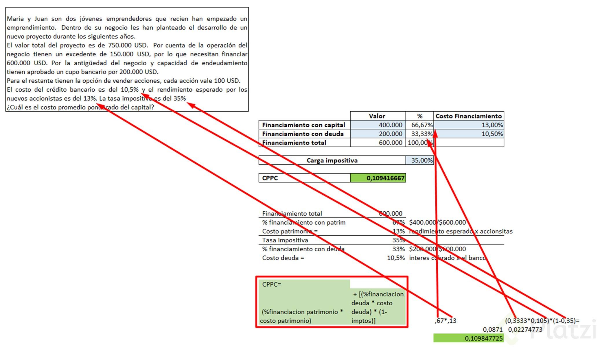 Para verdaderamente apropiarnos de este concepto, vamos a calcularlo paso a paso. Imaginemos que tenemos una empresa que necesita un millón de unidades monetarias para un proyecto y se financia mediante: