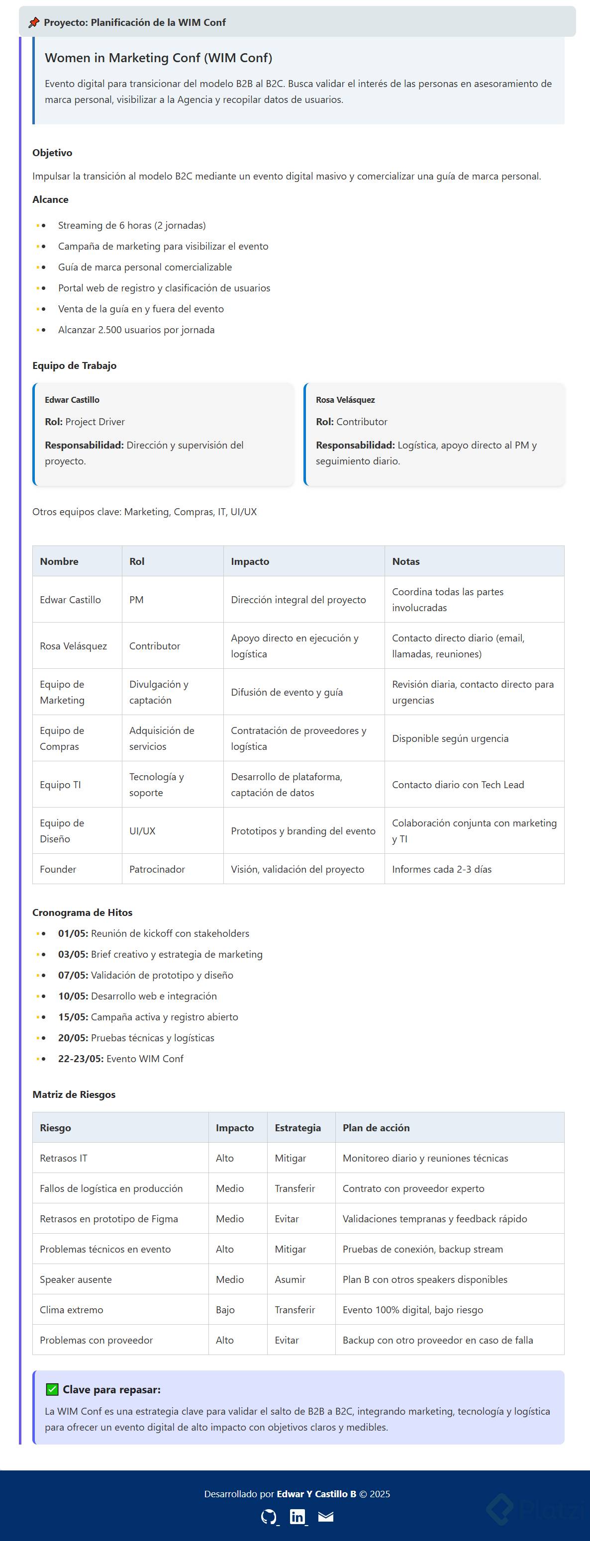 - Metas Claras: Tener objetivos claros es esencial para guiar todas las acciones del proyecto.