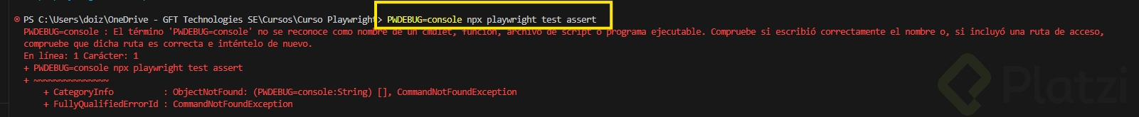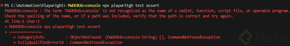 Para aprovechar al máximo las DevTools con Playwright, debes iniciar un modo específico utilizando pwdebug. Este se activa desde la terminal como una variable de entorno:
