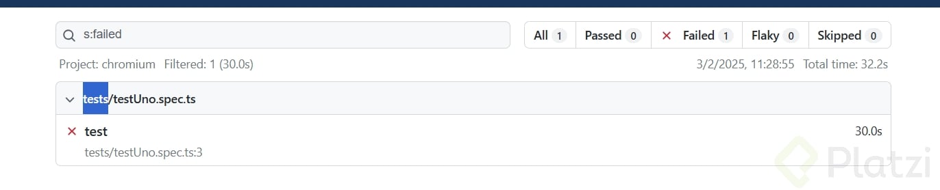 npx playwright show-report - Esto abrirá un reporte interactivo en un navegador donde podrás ver todos los pasos de tus tests, verifica las pruebas que pasaron y las que fallaron, e identifica cualquier test "flaky" (intermitente) o saltado.