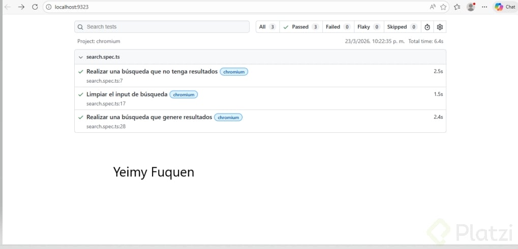 Está todo a tu disposición en un repositorio de GitHub. En la sección de recursos encontrarás el enlace al repositorio, junto con instrucciones detalladas sobre cómo instalar el entorno y ejecutar las pruebas. Este repositorio contiene tres tests que actualmente están fallando.