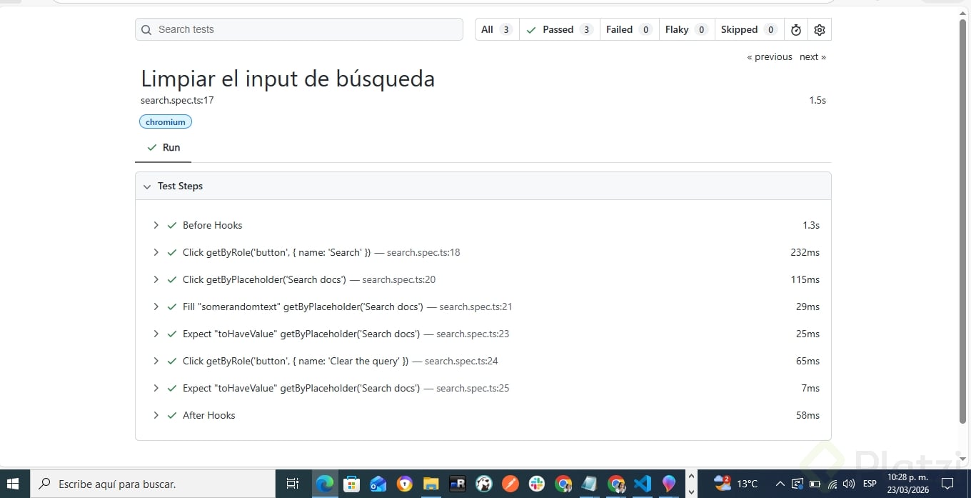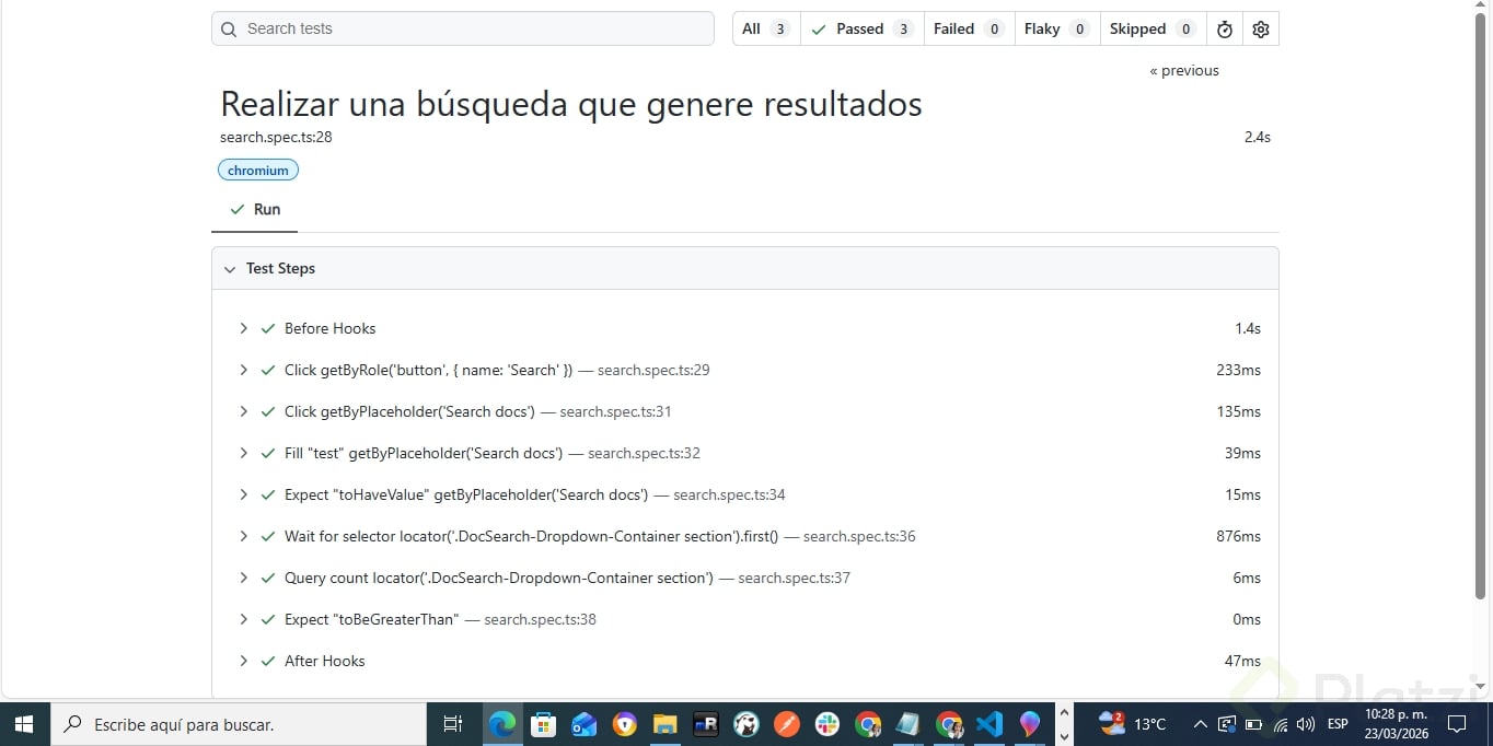 El punto de partida es un repositorio clonado con tres tests definidos en un archivo spec. Al ejecutar npx playwright test, los tres fallan en apenas nueve segundos. El reporte generado automáticamente lista cada test con su error correspondiente [0:38].