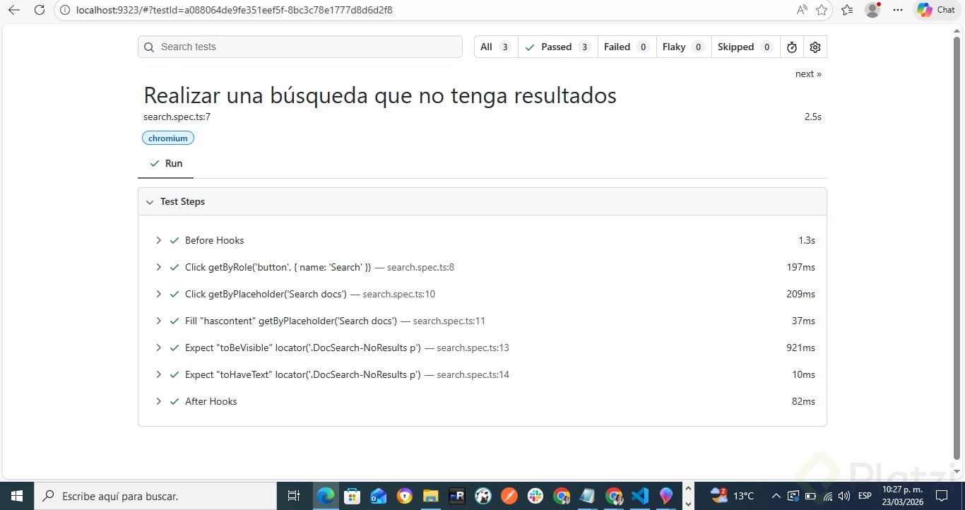 Tras estas correcciones, el primer test pasa exitosamente en cuatro segundos. El reporte confirma que todos los pasos se ejecutaron correctamente en dos punto siete segundos [8:05].
