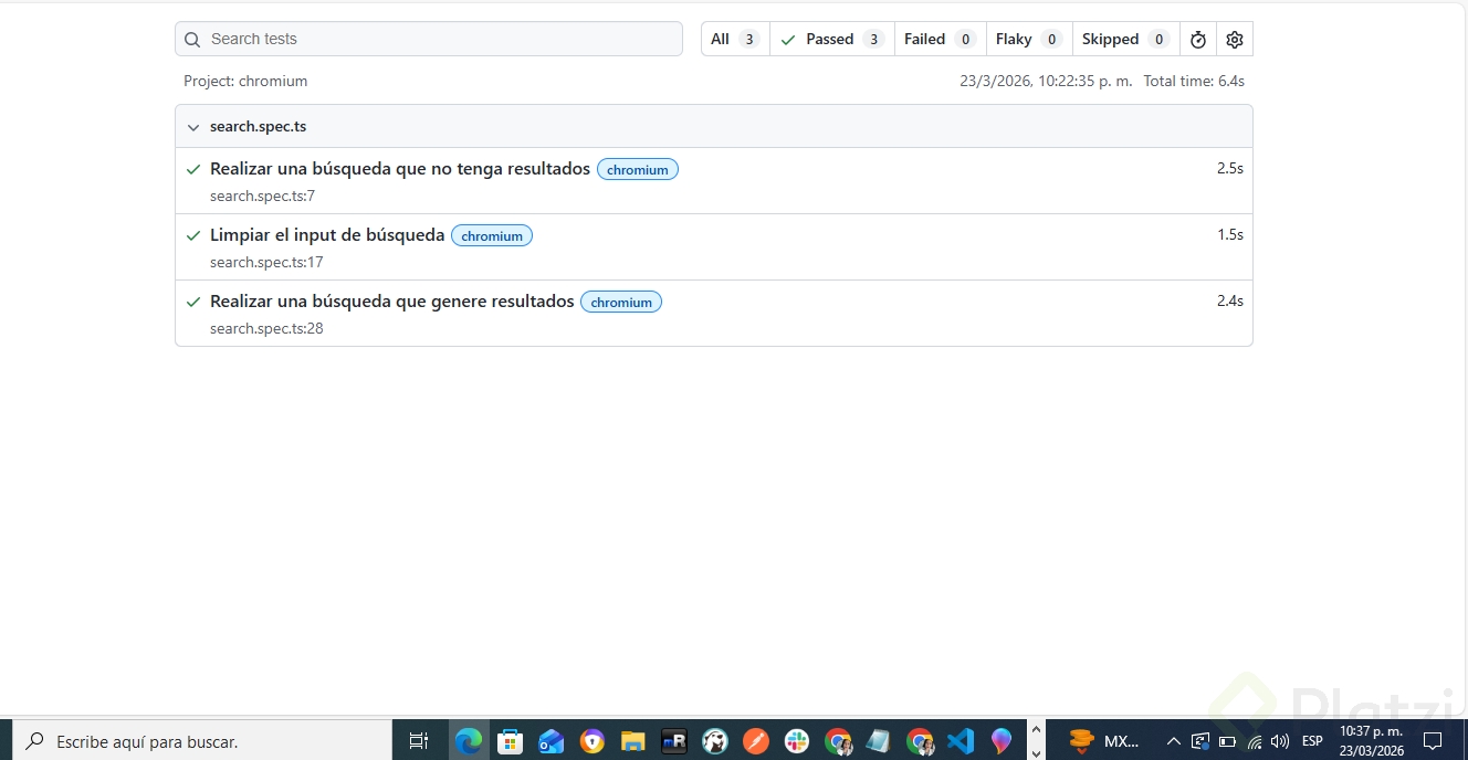 Playwright generará un reporte con los resultados del test indicando los errores y las líneas de código problemáticas. Por ejemplo, si un test para limpiar un input de búsqueda arroja un error debido a un texto esperado que no está presente, este error se indicará en el reporte con detalles sobre lo que fue esperado pero no encontrado.
