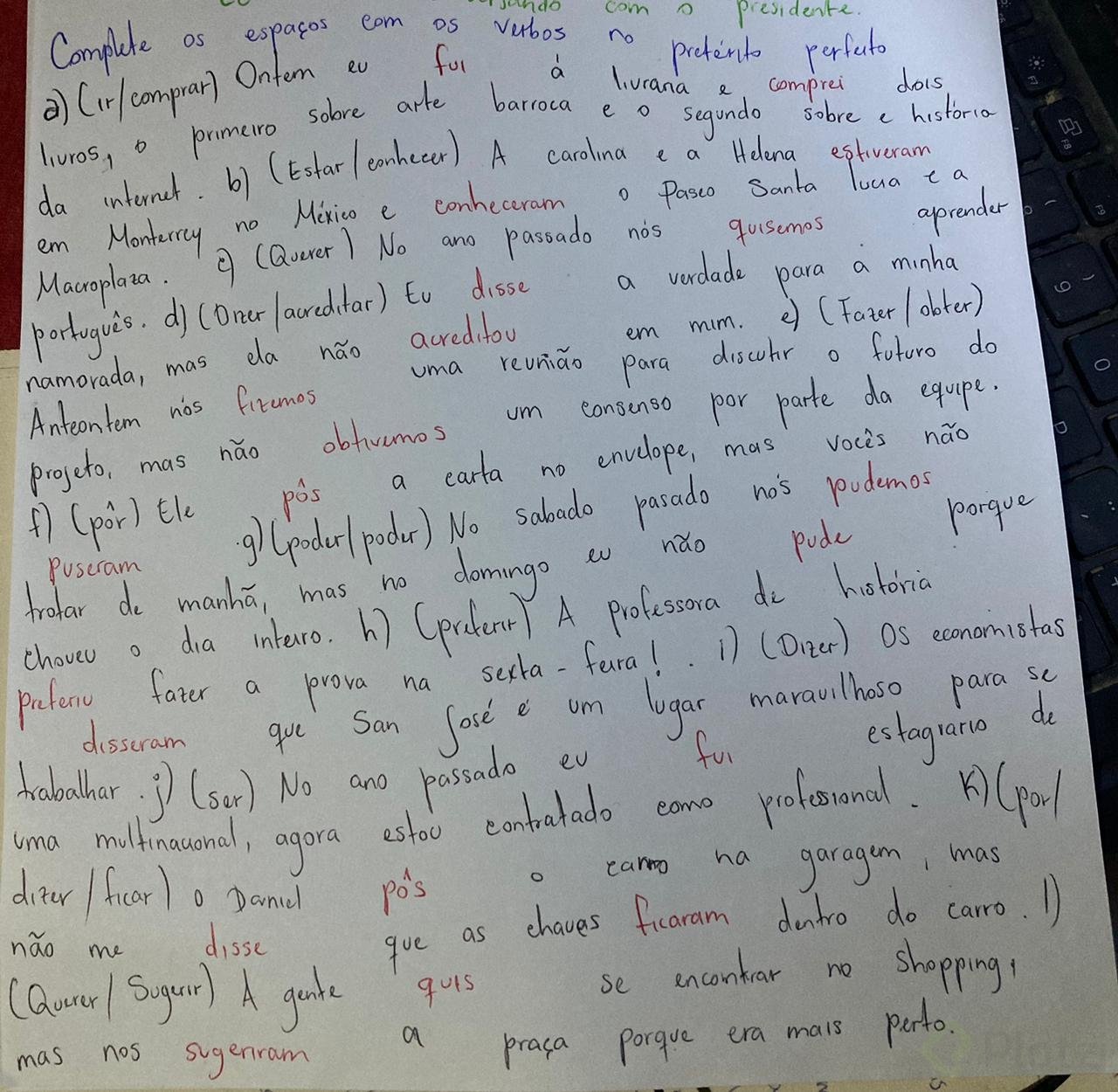 a) (ir/comprar) Ontem eu __________ à livraria e ________ dois livros, o primeiro sobre arte barroca e o segundo sobre a história da internet. b) (Estar/conhecer) A Carolina e a Helena ___________ em Monterrey no México e __________ o Paseo Santa Lucia e a Macroplaza. c) (Querer) No ano passado nós __________ aprender português. d) (Dizer/acreditar) Eu __________ a verdade para a minha namorada, mas ela não __________ em mim. e) (Fazer/obter) Anteontem nós __________ uma reunião para discutir o futuro do projeto, mas não _________ um consenso por parte da equipe. f) (Pôr) Ele __________ a carta no envelope, mas vocês não __________. g) (Poder/poder) No sábado passado nós __________ trotar de manhã, mas no domingo eu não __________ porque choveu o dia inteiro. h) (Preferir) A professora de história ____________ fazer a prova na sexta-feira! i) (Dizer) Os economistas ___________ que San José é um lugar maravilhoso para se trabalhar. j) (Ser) No ano passado eu __________ estagiário de uma multinacional, agora estou contratado como profissional. k) (Pôr/dizer/ficar) O Daniel __________ o carro na garagem, mas não me ____________ que as chaves ___________ dentro do carro. l) (Querer/sugerir) A gente __________ se encontrar no shopping, mas nos ____________ a praça porque era mais perto.
