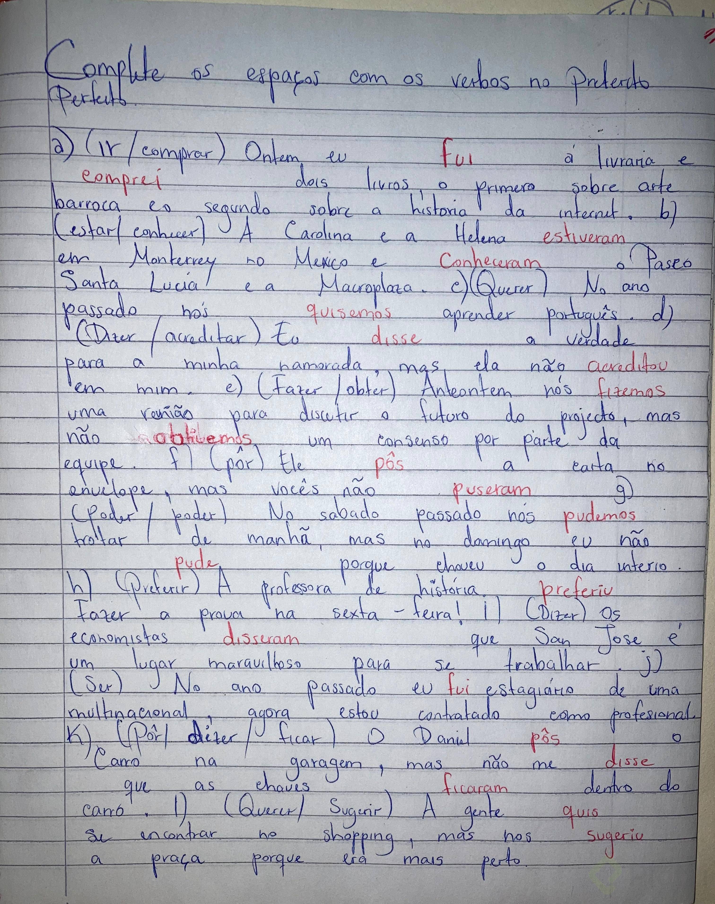 a) (ir/comprar) Ontem eu __________ à livraria e ________ dois livros, o primeiro sobre arte barroca e o segundo sobre a história da internet. b) (Estar/conhecer) A Carolina e a Helena ___________ em Monterrey no México e __________ o Paseo Santa Lucia e a Macroplaza. c) (Querer) No ano passado nós __________ aprender português. d) (Dizer/acreditar) Eu __________ a verdade para a minha namorada, mas ela não __________ em mim. e) (Fazer/obter) Anteontem nós __________ uma reunião para discutir o futuro do projeto, mas não _________ um consenso por parte da equipe. f) (Pôr) Ele __________ a carta no envelope, mas vocês não __________. g) (Poder/poder) No sábado passado nós __________ trotar de manhã, mas no domingo eu não __________ porque choveu o dia inteiro. h) (Preferir) A professora de história ____________ fazer a prova na sexta-feira! i) (Dizer) Os economistas ___________ que San José é um lugar maravilhoso para se trabalhar. j) (Ser) No ano passado eu __________ estagiário de uma multinacional, agora estou contratado como profissional. k) (Pôr/dizer/ficar) O Daniel __________ o carro na garagem, mas não me ____________ que as chaves ___________ dentro do carro. l) (Querer/sugerir) A gente __________ se encontrar no shopping, mas nos ____________ a praça porque era mais perto.