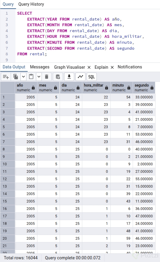 extract(hour FROM rental_date)para las horas.extract(minute FROM rental_date)para los minutos.