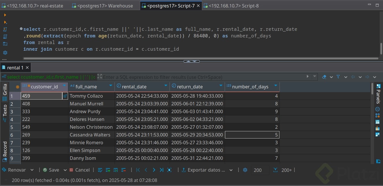 La necesidad aquí es simple pero en extremo práctica: determinar cuántos días ha durado una renta. Para lograrlo, la consulta utiliza: