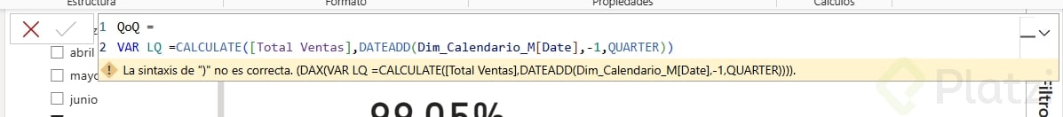 CALCULATEyDATEADDpara aislar el último trimestre. - Realiza una división para determinar la variación trimestral.