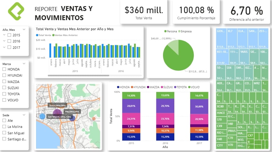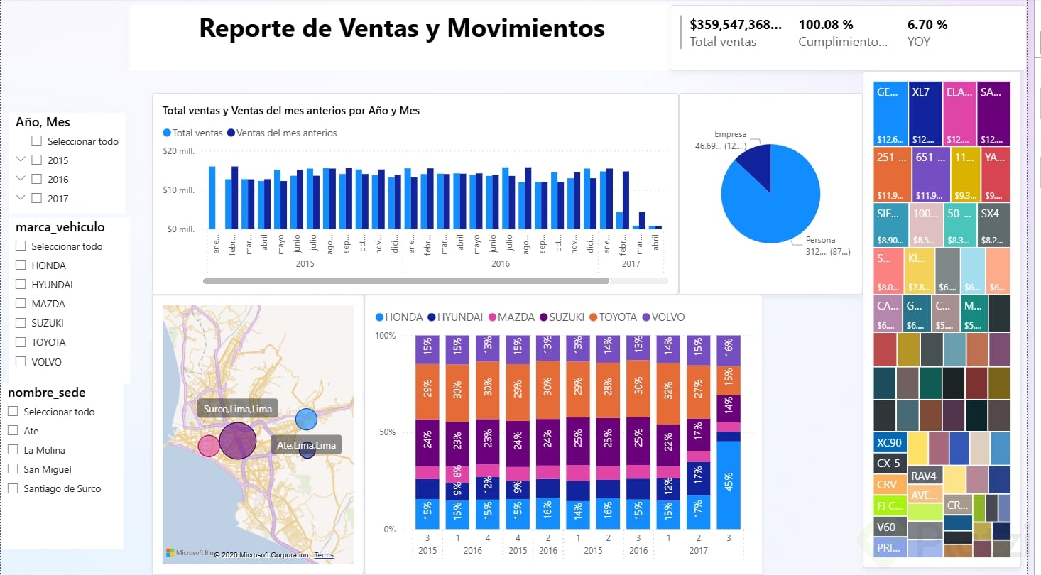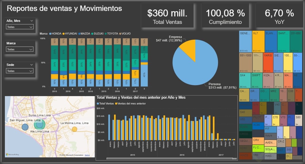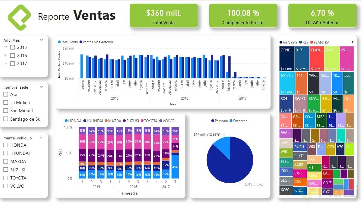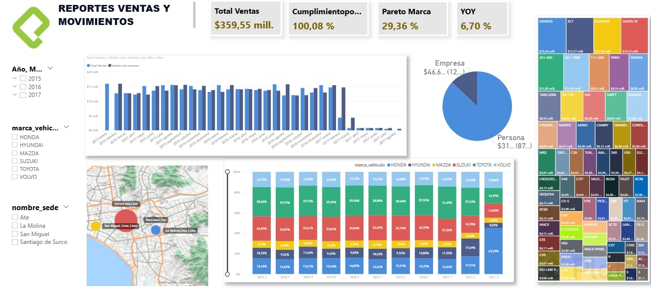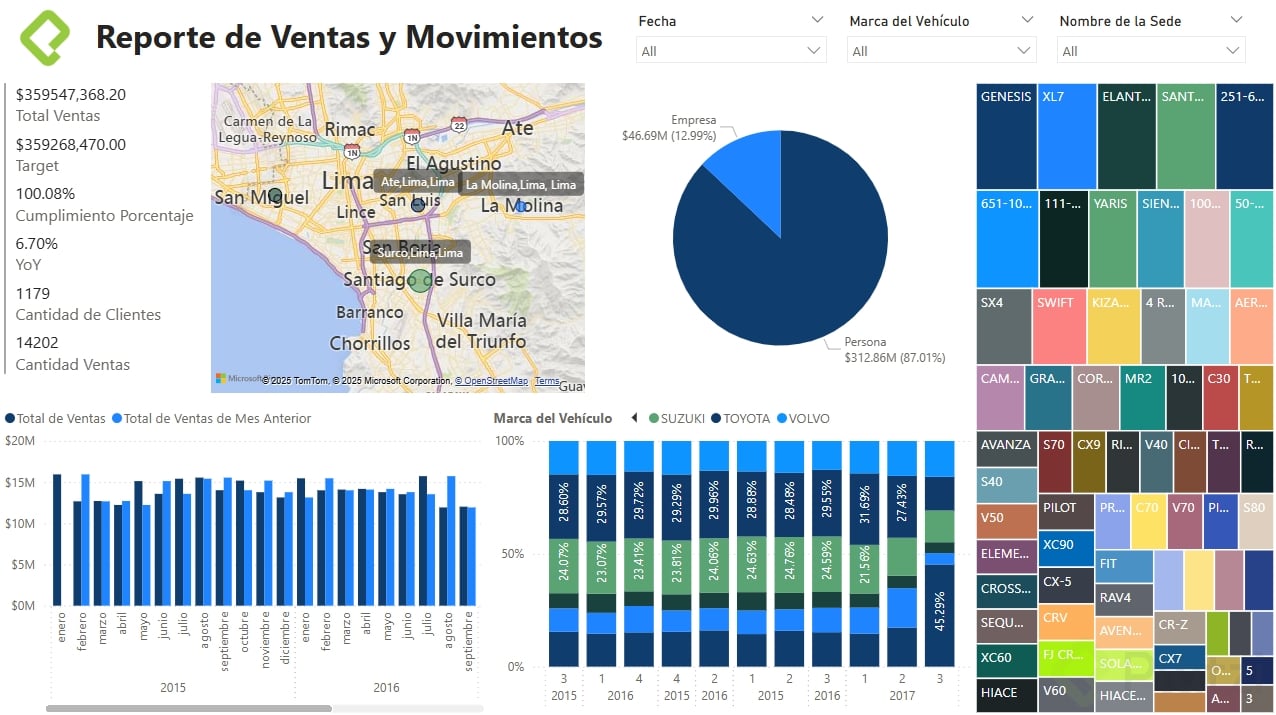 - Filtros y Segmentación: Incorpora filtros como la segmentación de datos por fechas, marcas de vehículos, y sedes comerciales para ofrecer distintas perspectivas.