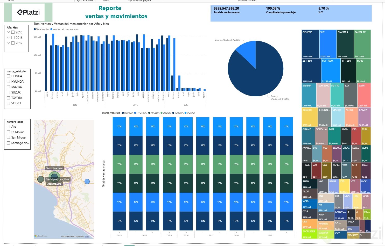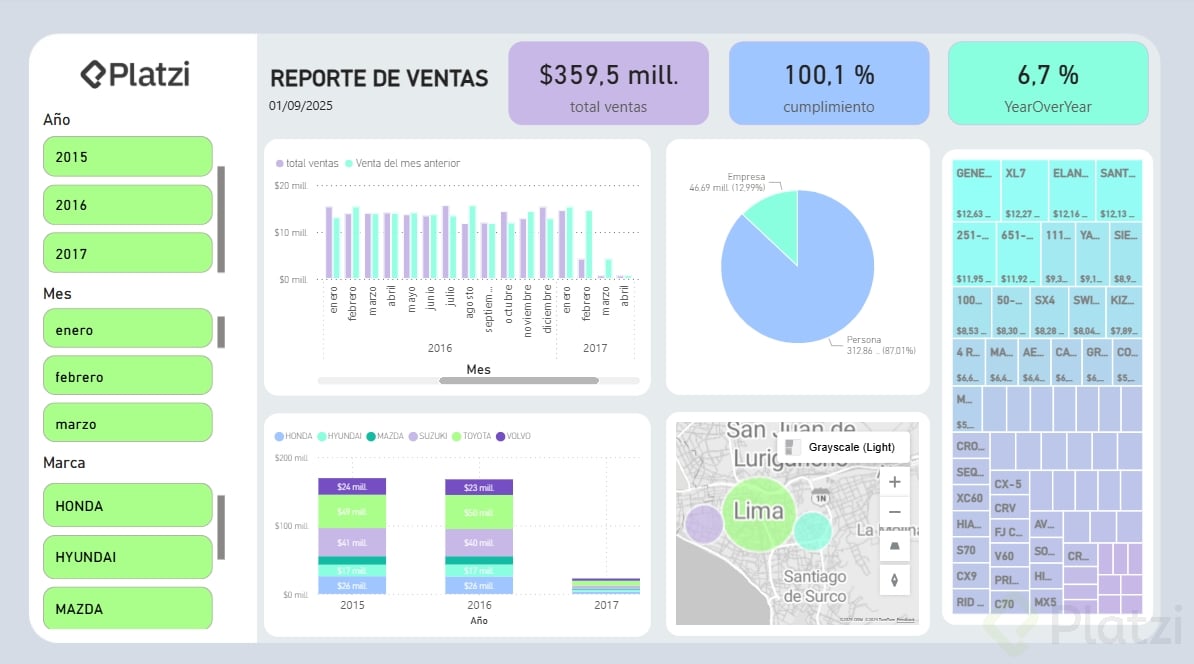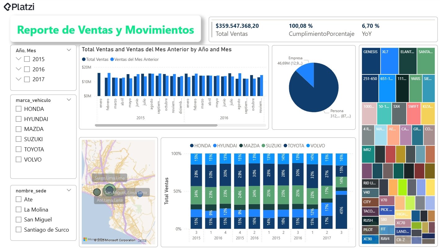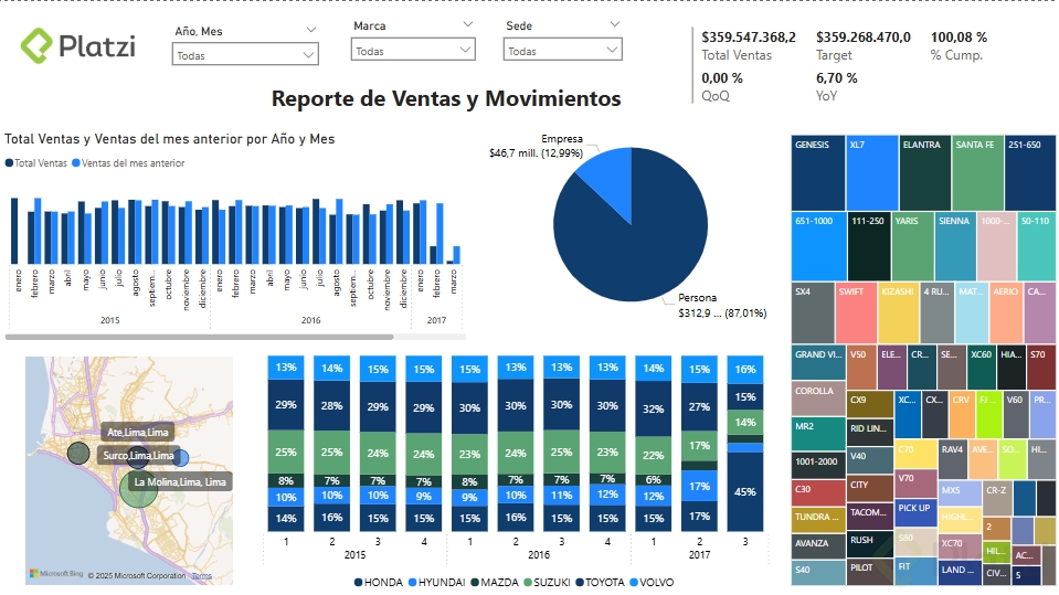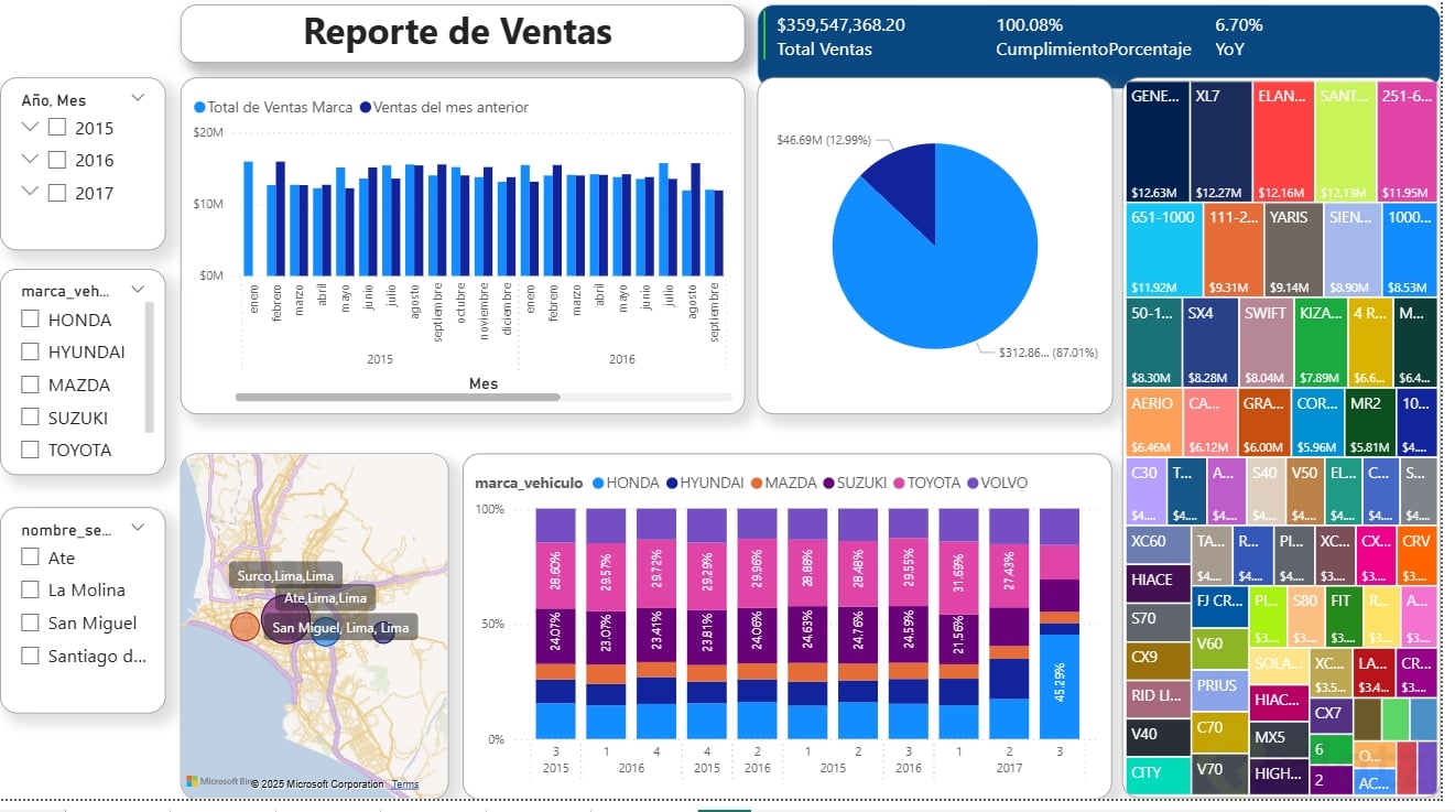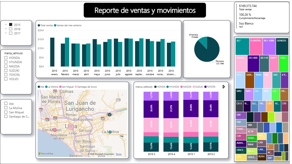 - Filtros y Segmentación: Incorpora filtros como la segmentación de datos por fechas, marcas de vehículos, y sedes comerciales para ofrecer distintas perspectivas.
