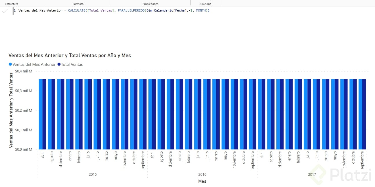 - Fórmulas personalizadas: Crear medidas DAX como "ventas del mes anterior" usando la función PARALLELPERIOD, lo cual exige el campo de fecha y el intervalo deseado (por ejemplo, -1 mes).
