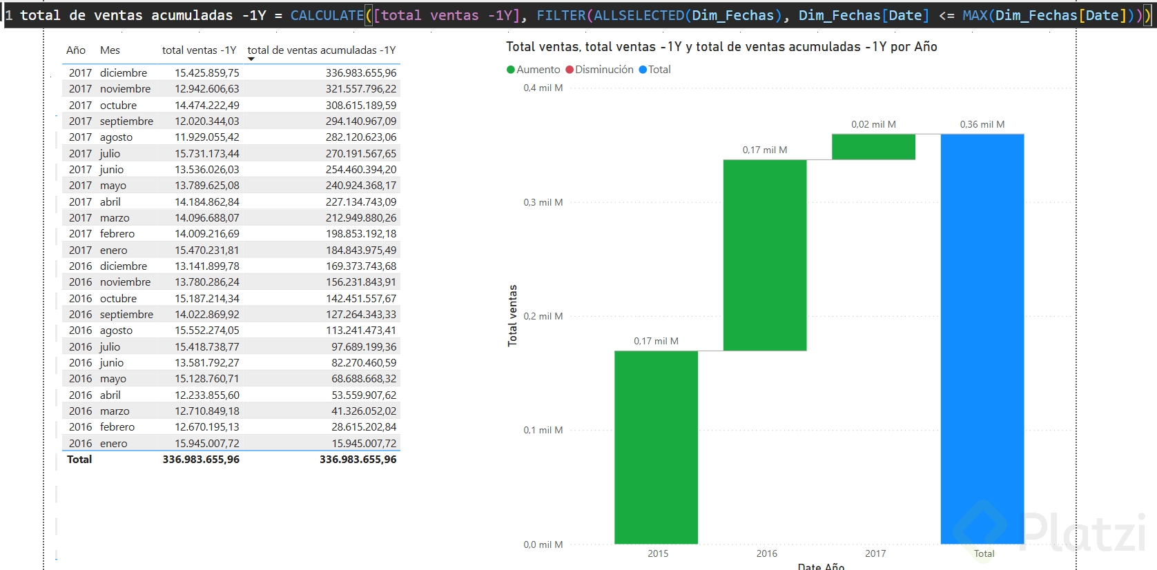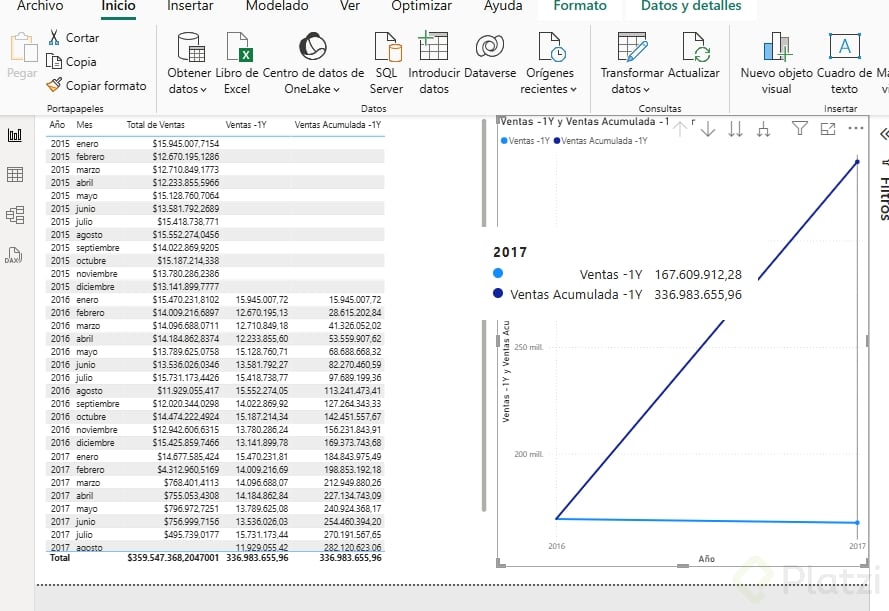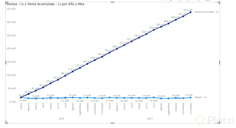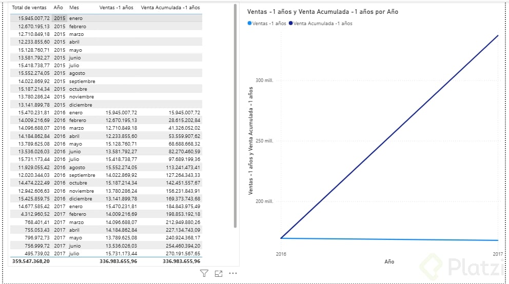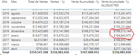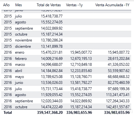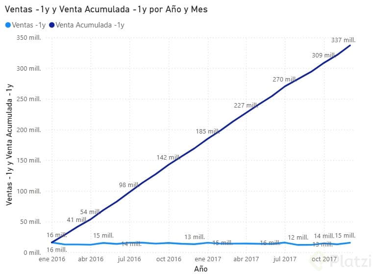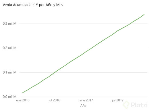 Una de las primeras medidas que puedes implementar es la venta acumulada, indispensable para visualizar el crecimiento de ventas a lo largo del tiempo: