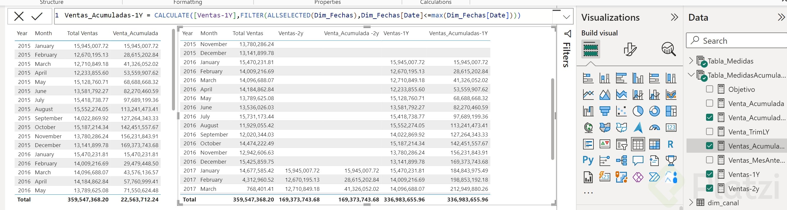 TOTALYTDpara calcular la venta acumulada anual basada en tu campo de fecha. - Para visualizarla, inserta una tabla con el campo de fecha a nivel de año-mes, y arrastra la medida de venta acumulada sobre ella.