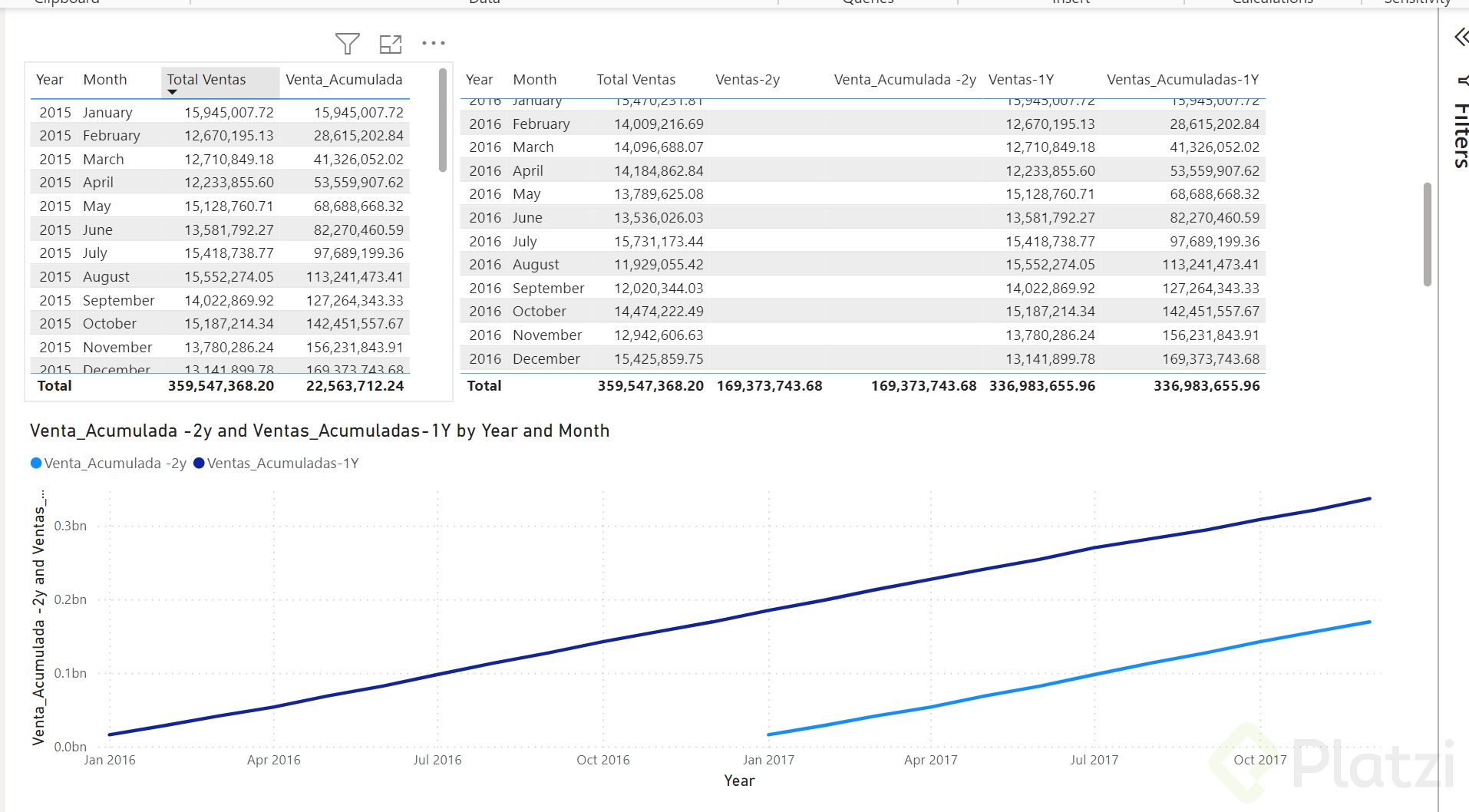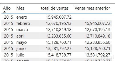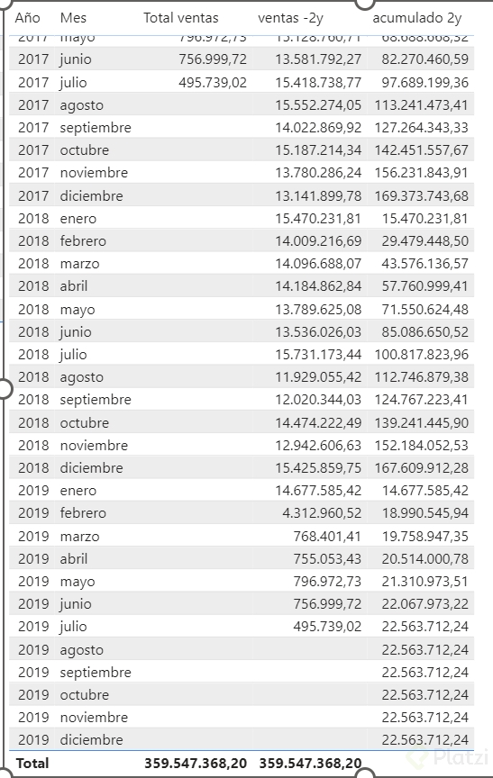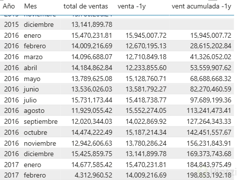 - En tu tabla de medidas acumuladas, genera una nueva medida para calcular las ventas de dos años hacia atrás.
