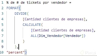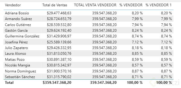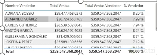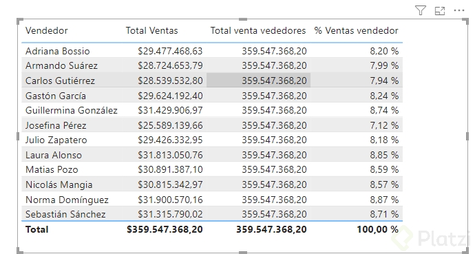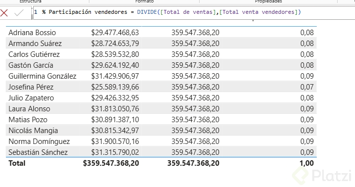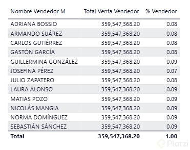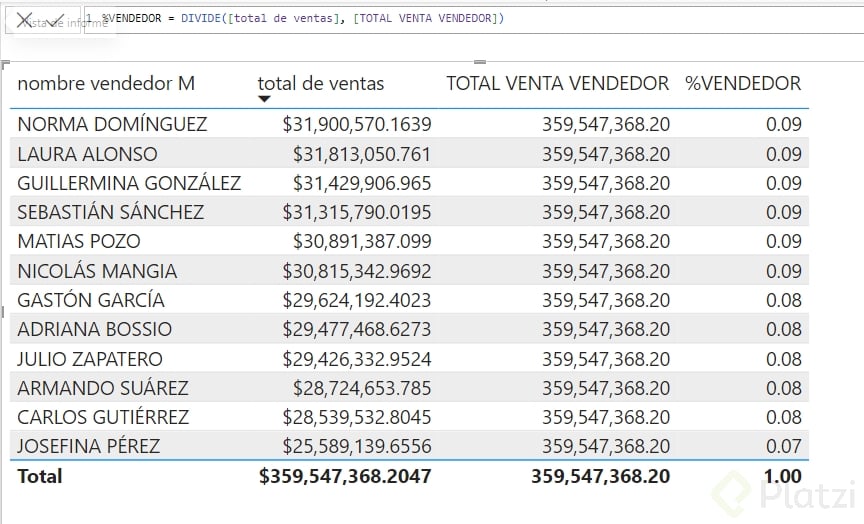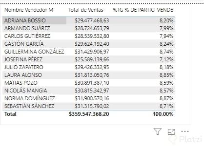 - Ejercicio propuesto: Practica calculando el porcentaje de participación de cada vendedor usando las funciones discutidas. Esto no solo refuerza tu comprensión sino que también amplía tus habilidades en Power BI.