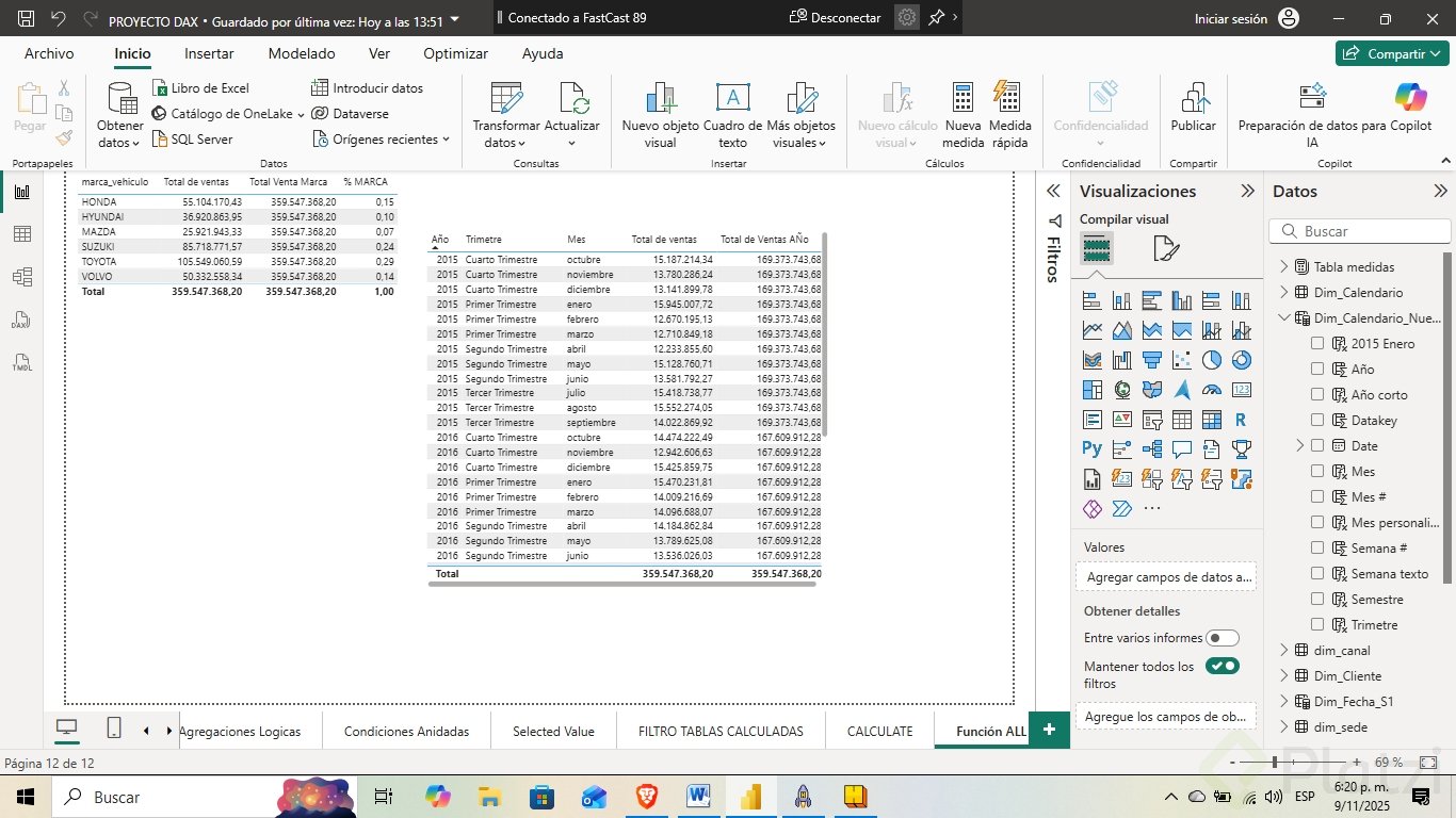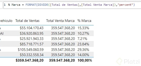 Total Ventas Marca = CALCULATE([Total Ventas], ALL('Tabla'[Marca Vehículo]))Con este cálculo, logras que el total de ventas se muestre completo para cada marca, sin segmentación.