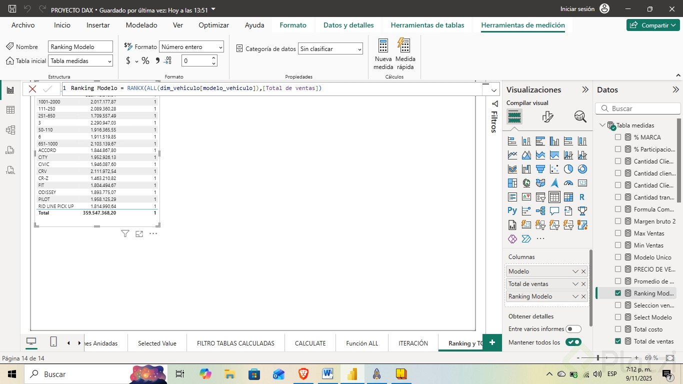 Ranking Modelo = RANKX(ALL('DIN Vehículo'[Modelo]), 'DIN Vehículo'[TotalVenta])