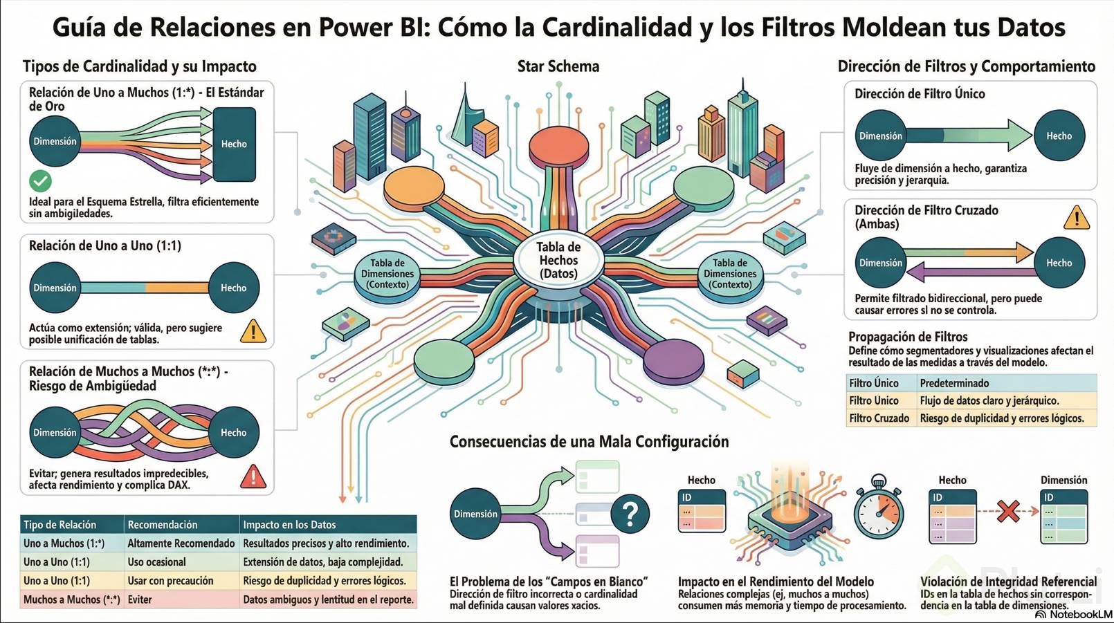 - Filtro único: Es el ideal y debería ser el objetivo en la mayoría de las situaciones, ya que simplifica y clarifica la dinámica entre tablas en un modelo estrella.