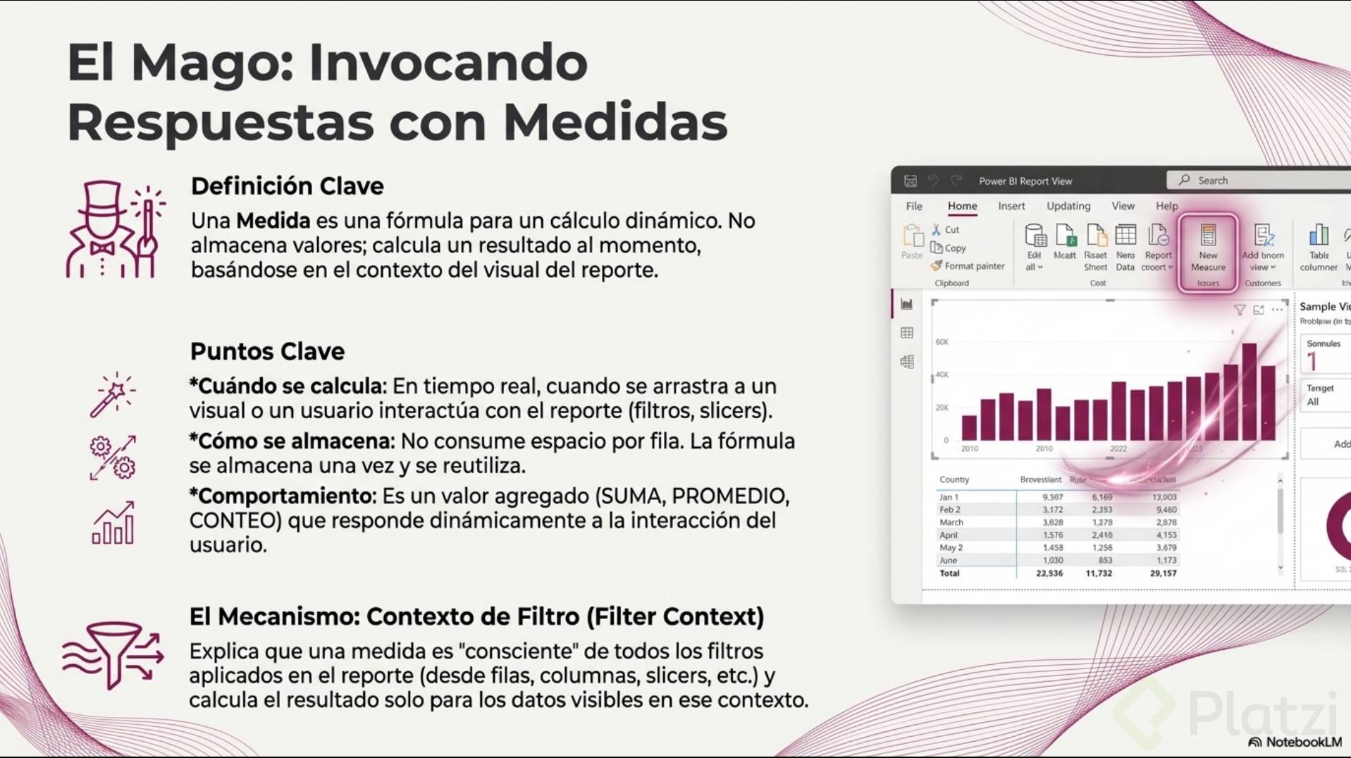 Las medidas en Power BI son una herramienta crucial para cualquier analista de datos. Utilizando DAX, puedes construir fórmulas avanzadas que optimizan el rendimiento de tus reportes. Al crear una medida, te aseguras de tener cálculos que se ejecutan en la memoria y no almacenan datos físicamente en tu modelo, lo que mantiene alta la velocidad y eficiencia de la visualización.