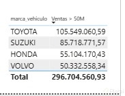 Avanzando en nuestra comprensión, podemos desarrollar medidas que incluyan varias marcas. Por ejemplo, creamos 'Total Venta Onda Toyota', que suma las ventas de ambas marcas: