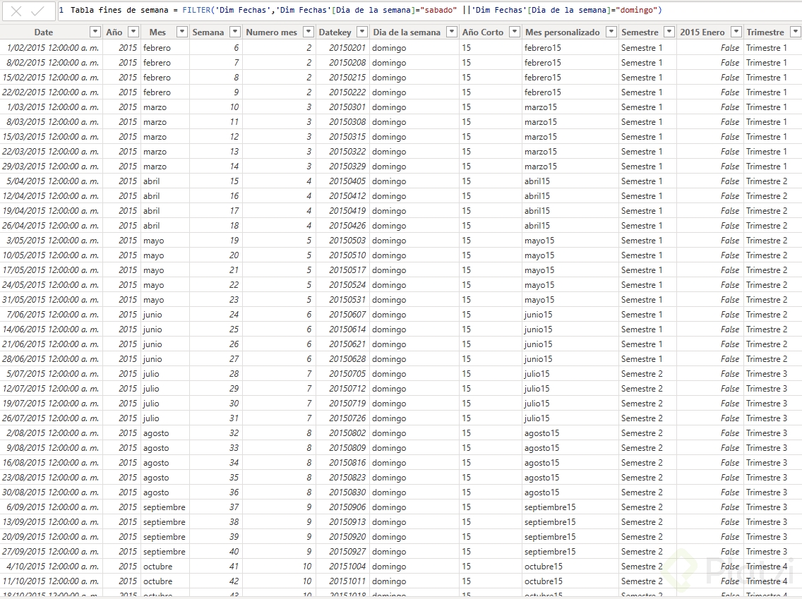 Tabla Fin de semana = FILTER(Dim_Fechas,Dim_Fechas[Número Día_Semana] = 7 || Dim_Fechas[Número Día_Semana] = 1 )