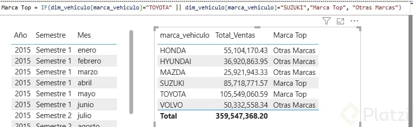 MarcaTop = IF( OR( 'tabla_vehículos'[Marca] = "Toyota", 'tabla_vehículos'[Marca] = "Suzuki" ), "Marca Top", "Otras Marcas" )
