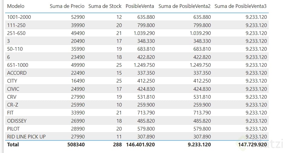 PosibleVenta3 = SUMX(FotoVehículo, FotoVehículo[Stock] * FotoVehículo[Precio])