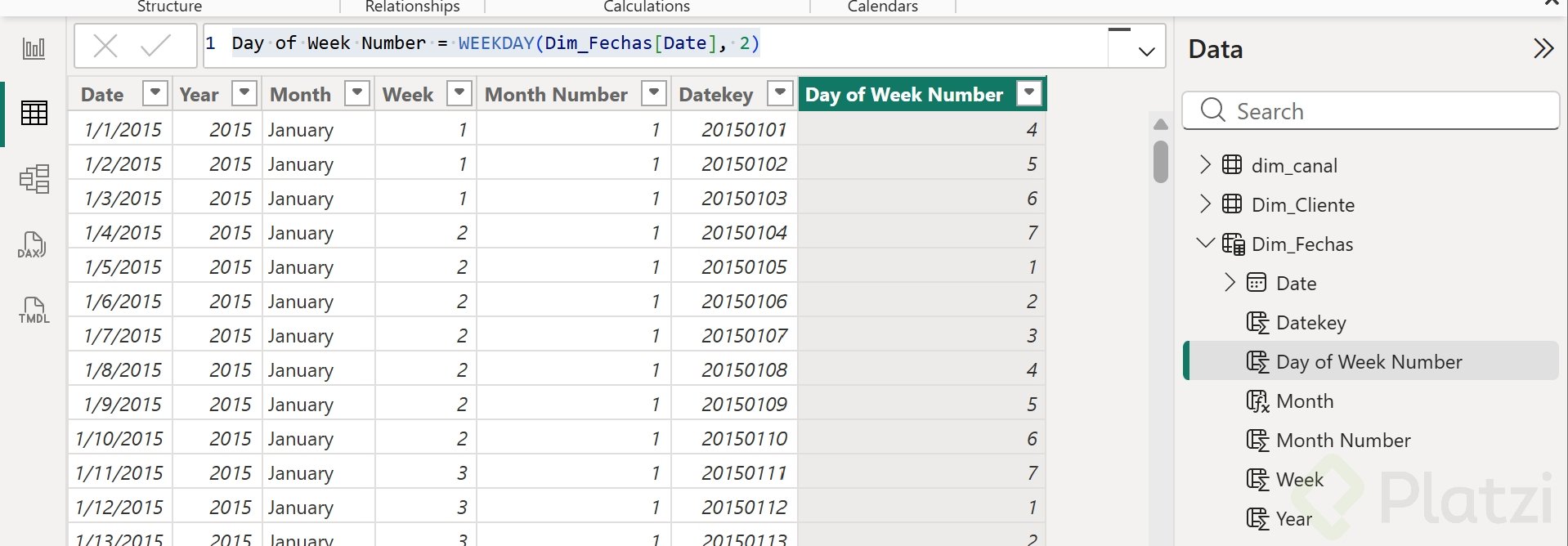 Una vez que tenemos nuestra tabla de fechas, es momento de añadir columnas calculadas que nos permitan realizar análisis más detallados.