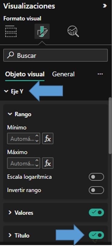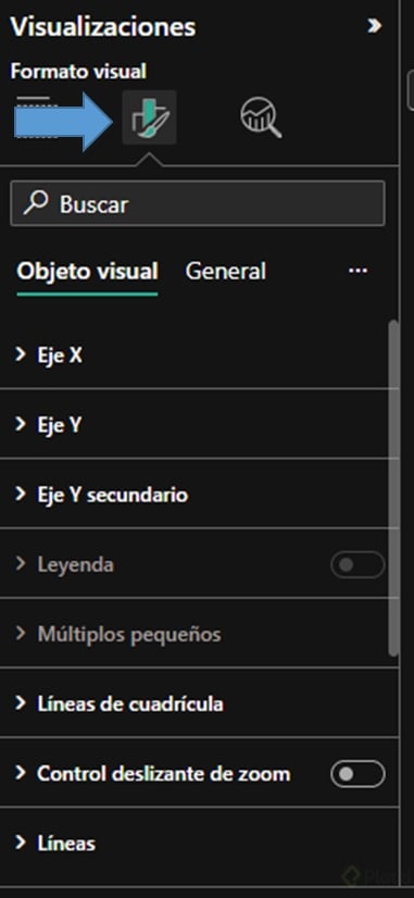 - Abre la sección de visualizaciones y selecciona el icono del pincel para acceder a la parte de formato.