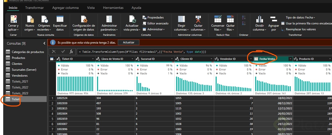 DATESpara especificar un rango de fechas. Por ejemplo, si tienes ventas entre 2021 y 2023, utiliza estos años como inicio y fin de tu rango. - La fórmula se verá algo así: