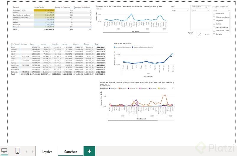 - Historial de ventas y desempeño de sucursales: Es fundamental visualizar el historial de ventas de cada sucursal y distinguir las de mejor y peor rendimiento. Esto se puede abordar con gráficos comparativos y tablas resumen.